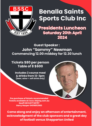 The 2024 President's Lunch Lunch Tickets - SOLD OUT Attendance and Drinks only - $60 President Geoff Hill invites our Sponsors, members and supporters to join us for the 2024 President's Lunch Β  Guest SpeakerΒ  John "Sammy" NewmanΒ  Β