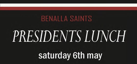 2023 President Geoff Hill will host the President's lunch with our valued Sponsors of Benalla Saints Sports Club as we take on Shepparton United at the Showgrounds.  The day will commence at 12.30 pm in the Benalla Lakeside Centre with a two course lunch and drinks at bar prices.  Doug Hawkins, Footscray / Western Bulldogs champion will be our guest speaker and will entertain us with stories of his playing days in the VFL / AFL. Presentations by Senior AFL Coaches - Martk Mackenzie and Will Martiniello and Netball A/B Grade Coach Jo Toms.  Members and supporters are welcome to purchase tickets below to the lunch.  All tickets must be purchased before May 4th, to allow us to cater for the event.
