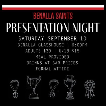 Benalla Saints Presentation night will be held Saturday 10th September. The night will consist of a vote count of the last 3 rounds of each grade followed by team presentations with music to follow long into the night.   All are welcome to come along and celebrate the 2022 season