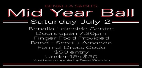 Mid Year Ball 2022 Benalla Saints invites you all to attend its annual Mid Year ball - our biggest function of the year! All are welcome so get your friends and start searching for the perfect outfit! The night will not disappoint! The ball is held round 12 - home game against Seymour! Entertainment - BAND - Scott & Amanda Dress - Formal Fingerfood Provided Entry - $50, U18s - $30 and must be accompanied by Parent / Guardian