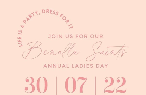 Benalla Saints invites all lovely ladies to attend their annual Ladies Day function! All are invited to attend what is always a lovely day filled with wine and laughter and this year will include a cocktail hour featuring some delicious drinks! Pre purchase your tickets from Rambling Rose or Thursday night dinner at the clubrooms or online for $30 or pay $35 at the door on the day! Ticket Includes: Entry to Game / Ground Drink on Arrival  Grazing Table Luck Door Prizes  Entertainment by Adam Toms COCKTAIL HOUR Starts at 4pm   So get your mothers, sisters, aunties, daughters and gal pals together for what is set to be another amazing function!     Please note - this is a child free event.